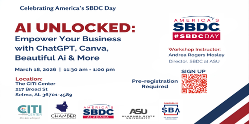 In celebration of America's SBDC Day, the Alabama Small Business Development Center at Alabama State University, in partnership with the Selma-Dallas County Chamber of Commerce, The CITI Center, and the Black Belt Community Foundation, invites entrepreneurs and aspiring business owners to participate in a hands-on workshop designed to support and strengthen small businesses in our community.