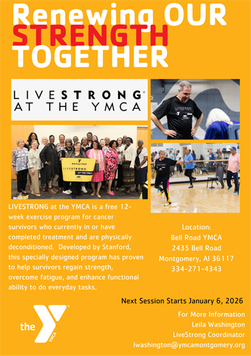Name: Bell Road YMCA LiveStrong ProgramDate: January 6, 2026 Event Description: Event Description:Join the LiveStrong Program at Bell Road YMCA The LiveStrong Program is a 12-week health and wellness journey designed specifically for cancer survivors and those currently battling cancer. This supportive, research-based program helps participants reclaim their total health—physically, emotionally, and socially—in a safe and encouraging environment. Through personalized fitness plans, group support, and a welcoming community, LiveStrong empowers you to regain strength, boost confidence, and connect with others who understand your journey. 12-week small group program