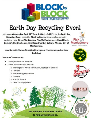 Join us on Wednesday, April 22, 2026 from 9:00 a.m. – 1:00 p.m. for the Earth Day Recycling Event hosted by Block by Block with special community partners: Main Street Montgomery, Pick Up Montgomery, Sabel Steel, Eugene’s Hot Chicken and the Department of Cultural Affairs / City of Montgomery.