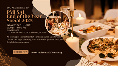 Name: PMI South Alabama Chapter: End of the Year Social 2025Date: November 8, 2025Time: 5:00 PM - 10:00 PM CSTEvent Description: