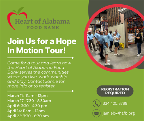 Name: Hope in Motion Tour with the Heart of Alabama Food BankDate: April 6, 2026Time: 3:30 PM - 4:30 PM CDT