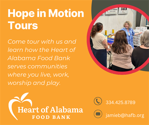 Name: Hope in Motion Tour with the Heart of Alabama Food BankDate: May 12, 2026Time: 7:30 AM - 8:30 PM CDT