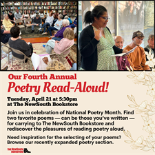 Our poetry read-aloud is a spring ritual — held annually in April in celebration of National Poetry Month. Friends and customers gather, seated in a circle, to share favorite poems which are read aloud. The sound of the words, the lilt of the human voice — these are joyful music. It is wonderful to give an hour to thoughtful listening. Come be part of the fun. Bring two poems of your selection (can be two you’ve personally written or not) and find your way to The NewSouth Bookstore on Tuesday, April 21, 2026 at 5:30 p.m.