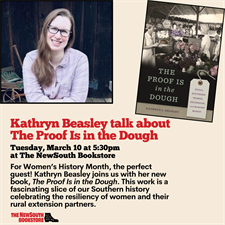 Event Description:For Women’s History Month, the perfect guest! Kathryn Beasley joins us with her new book The Proof Is in the Dough, which examines how rural Southern women, White and Black, used the extension system during the Progressive Era (1920s and ’30s) to make ends meet. This work is a fascinating slice of our Southern history celebrating the resiliency of women and their rural extension partners. Come learn about it on Tuesday, March 10, 2026 at 5:30 p.m.Location:The NewSouth Bookstore