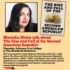 Event Description:A magisterial new account of the Reconstruction era brings esteemed historian Manisha Sinha to The NewSouth Bookstore on Wednesday, February 11, 2026 at 5:30 p.m. Don’t miss her talk about The Rise and Fall of the Second American Republic: Reconstruction, 1860–1920, a landmark new work which redefines our understanding of the period, “restoring its place as the hinge upon which American history turns,” says Jill Lepore. Please join us for this very special program on Wednesday, February 11, 2026 at 5:30 p.m.Location:The NewSouth Bookstore