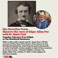 Make a date with a poem and Dr. Susie Paul. Off the success last year of One Hour/One Poem, Paul returns to The NewSouth Bookstore to teach one great nineteenth- or early twentieth-century poem in each of four sessions of an hour or less. The program is a deep dive into the work of four significant American writers, all giants of the poetic form: Edgar Allan Poe, Paul Laurence Dunbar, Robert Frost, and Langston Hughes. Paul is a master educator with a deep love of poetry, who is thrilled to have the opportunity to teach these works. “A Dream Within a Dream” by Edgar Allen Poe, written in 1849, is the subject of her first session, scheduled for Tuesday, February 10, 2026 at 5:30 p.m. Hope you can join us.