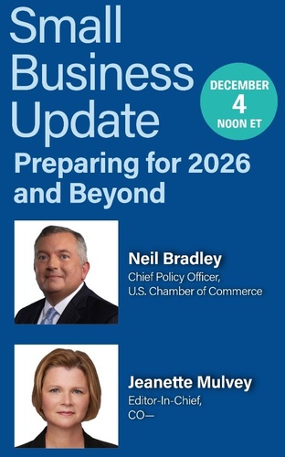 Join us virtually on December 4 at noon ET as U.S. Chamber Chief Policy Officer Neil Bradley and CO— Editor-in-Chief Jeanette Mulvey discuss how small businesses can navigate key opportunities and challenges in 2026, covering everything from taxes and tariffs to hiring, AI, and immigration. |