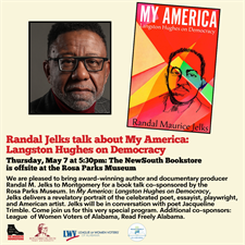 We are offsite at the Rosa Parks Museum for a truly special program featuring award-winning author and documentary producer Randal M. Jelks on Thursday, May 7, 2026 starting at 5:30 p.m. We are pleased to bring him to Montgomery for a talk about My America: Langston Hughes on Democracy, a new book in which he delivers a revelatory portrait of the celebrated poet, essayist, playwright, and American artist. Jelks will be in conversation with poet Jaqueline Allen Trimble. Event co-sponsors include the Rosa Parks Museum, League of Women Voters of Alabama, and Read Freely Alabama.