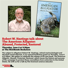 Event Description:The subject is alligators! Robert W. Hastings, retired marine biologist and devoted conservationist, is our special bookstore guest on Thursday, June 4 at 5:30 p.m. We gather to celebrate the release of his new book, The American Alligator: Abused, Protected, Restored, which traces the history and success of the campaign to protect these crocodilians from extinction in the United States. Be with us for a talk by this foremost science educator.Location:The NewSouth Bookstore