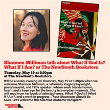 Event Description:It’ll be a lovely evening on Thursday, May 19 at 5:30pm when we welcome Shannon Milliman, a nationally staged playwright, poet/essayist, and TEDx speaker, whose work blends humor, heart, and a keen eye for the beauty in everyday moments. She will read from her book of selected verse, What If God Is? What If I Am?, and a work in progress, These Mountains Should Be Ours. Let’s welcome this talented Alabama transplant!Location:The NewSouth Bookstore