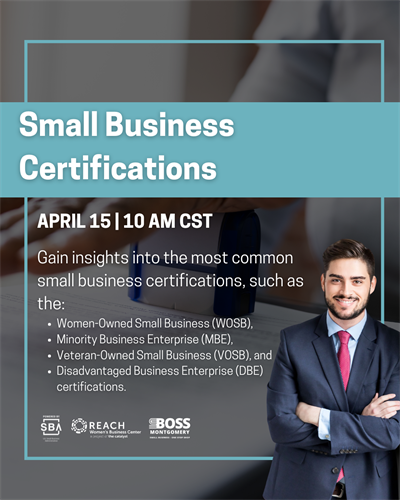 Event Description:Join us to explore the most common small business certifications and how they can help you grow and compete for new opportunities. This session will cover key certifications such as Women-Owned Small Business (WOSB), Minority Business Enterprise (MBE), Veteran-Owned Small Business (VOSB), and Disadvantaged Business Enterprise (DBE). Learn the benefits, eligibility requirements, and how to get certified to position your business for success.Location:Online (Virtual Event)Date/Time Information:Wednesday, April 15, 2026 at 10:00 a.m.Contact Information:REACH Women’s Business Center / SBOSS MontgomeryFees/Admission:FreeSet a Reminder: