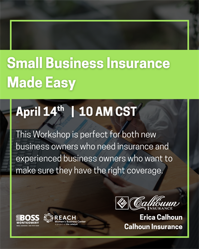 Event Description:Understanding insurance is essential for protecting your business. Join us for this informative workshop designed for both new and experienced business owners. Learn the types of insurance your business may need, how to choose the right coverage, and how to avoid common gaps that could put your business at risk. Led by Erica Calhoun of Calhoun Insurance, this session will help you make confident, informed decisions about your business protection.Location:Online (Virtual Event)Date/Time Information:Tuesday, April 14, 2026 | 10:00 a.m.Contact Information:REACH Women’s Business Center / SBOSS MontgomeryFees/Admission:FreeSet a Reminder: