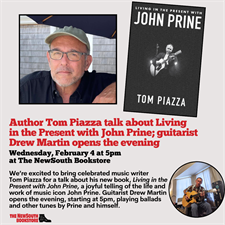 Celebrated music writer Tom Piazza is our guest at The NewSouth Bookstore for a talk about his new book, Living in the Present with John Prine, a joyful telling of the life and work of his dear friend, music icon John Prine. The book, which follows the artist in his last two years of life, Roseanne Cash calls an “intimate, moving, superbly written account.” Guitarist Drew Martin opens the evening, starting at 5:00 p.m., playing ballads and other tunes by Prine and himself. It’ll be a dazzling evening of tribute. Mark your calendars to join us on Wednesday, February 4, 2026 at 5:00 p.m. (Please note 5:00 p.m. start time.)