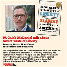 Event Description:We are proud to have as our special guest W. Caleb McDaniel for a talk about his book, Sweet Taste of Liberty: A True Story of Slavery and Restitution in America. An epic tale of a Black woman who survived bondage twice and won reparations against impossible odds, it's breathtaking work, beautifully written, which won the Pulitzer Prize for History. Join us at The NewSouth Bookstore on Tuesday, March 31, 2026 at 5:30 p.m.Location:The NewSouth Bookstore
